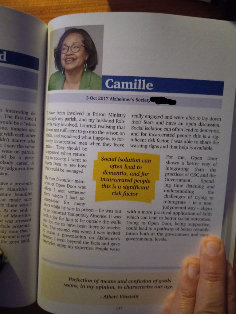 My two favorite memories (were) when I met someone there whom I had accompanied while he was in prison – he was out on an Escorted Temporary Absence. It was such a joy for him to be outside the walls, and for me to have been there to receive him. The second was when I was invited to (do) a presentation on Alzheimer’s disease. I went beyond the facts and gave examples using my expertise. People were really engaged and were able to lay down their fears. Social isolation can lead to dementia, and for incarcerated people this is a significant risk factor. I was able to share the warning signs and that help is available.